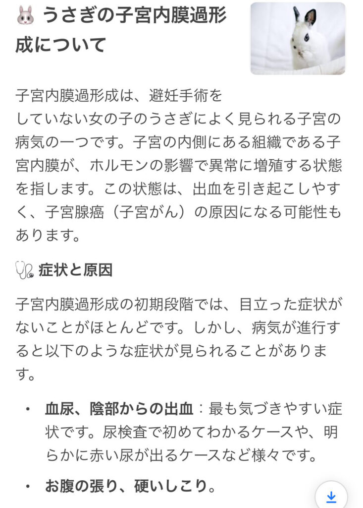PS.このブログを読んだお友達からメッセージをいただきました🍀お友達のお家のごま姉さん🐰も2歳の時に出血して緊急手術をしたそうです。私はてっきり子宮疾患はもっと歳を重ねてからなる病気だと思っていたのですが、そんなこともないようです‼️固定観念でした💦(↓ごま姉さんの病気の詳細)
