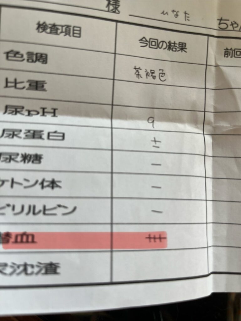 祈るような気持ちで病院へ連れて行き、尿検査をした結果、はっきりと「潜血反応」が出てしまいました。😭